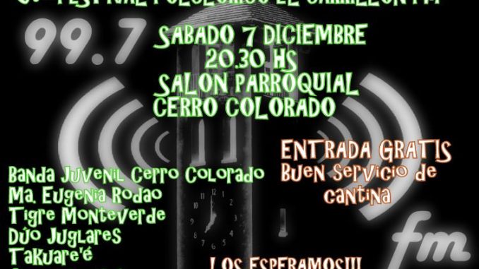 En el día de la fecha se estará celebrando el 5° Festival Folklórico de El Carrillón FM desde las 20:30 horas en el Salón Parroquial.