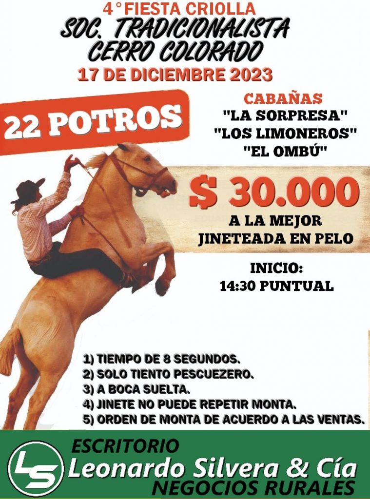 El próximo domingo 17 de diciembre, se llevará a cabo la cuarta edición de la Fiesta Criolla, que contará con la participación de 22 potros provenientes del escritorio Leonardo Silvera & Cía. Negocios Rurales. El evento se llevará a cabo en las cabañas «La Sorpresa», «Los Limoneros» y «El Ombú». Se otorgarán 30.000 pesos al mejor jinete en pelo. El inicio está programado para las 14:30 horas puntualmente